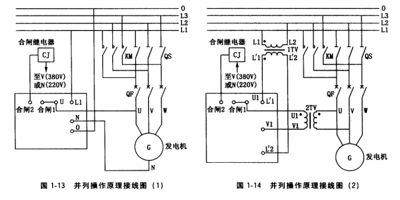 ① 斷開隔離開關QS,合上空氣開關QF (對于無QS直接用QF的,則應斷開QF),然 后起動待并機組,調節其轉速和電壓,通過頻率表、電壓表、同步指示儀檢測,確認上述4 個條件與主機相同時,迅速合閘,交流接觸器KM接通,然后合上QS, KM斷開,完成并 列投人操作。合上該機負荷開關,投人并列帶載運行。