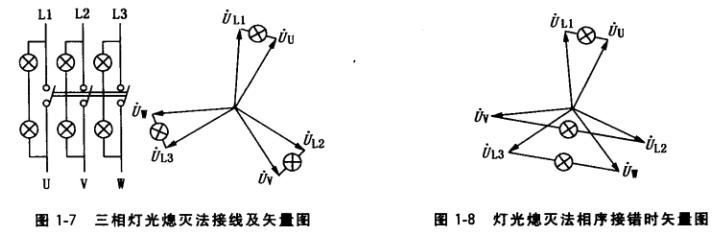 ①三相燈光熄災法。圖1-7是相燈光熄滅法并機接線及矢量圖。對于400V系統,每 相用兩個220V燈泡串聯后,跨接在對應相開關兩端(對于220V系統.只要用一只220V