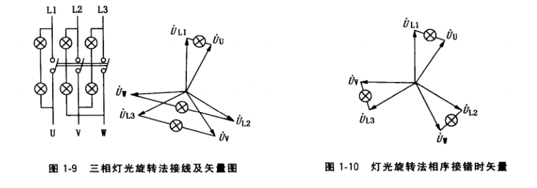 ② 燈光旋轉法。圖1-9是燈光旋轉法并列接線。當相序一致時,待并發電機和系統電壓 向量間的關系如圖所示。從圖中可看出,在任何時間3組燈的亮度不一樣,呈旋轉變化。當 發電機滿足同期條件時,加在L1、U間的電壓為零,加在L2、W和L3、V間的電壓均為線電壓,因此,接在L1、U間的燈泡熄滅,此時可將發電機并人系統。若待并發電機相序 接錯,如圖1-10所示,則3組燈光不是旋轉發光,而是同明同暗,此時不能將發電機并人 系統。