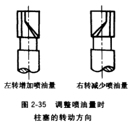 噴油量不均勻調(diào)整時,可將調(diào)節(jié)齒桿移到停止供油的位罝。用小螺絲刀旋松調(diào)節(jié)齒輪上 的鎖緊螺釘?再用小螺絲刀頭觸在油雖控制套筒的小孔中,用小手錘輕輕地敲擊螺絲刀柄, 若噴油量過小,使控制套筒向左轉(zhuǎn)一定角度;噴油最過大,使控制套筒向右轉(zhuǎn)一定角度。轉(zhuǎn)動控制套筒來調(diào)整噴油量大小時.應(yīng)根據(jù)其構(gòu)造確定轉(zhuǎn)動方向,如圖2-35所示。調(diào)整完成 后,再做試驗進(jìn)行復(fù)驗,各缸噴油量應(yīng)接近一致為止。
