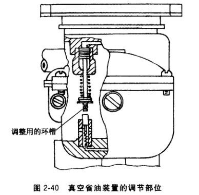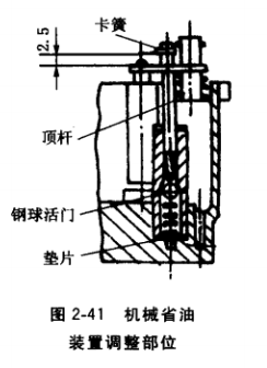 (4) 省油裝置的維修。231型汽化器裝有真空省油裝置和機械省油裝罝。真空省油裝置靠真空控制,可借活塞杠桿下端3道環(huán)梢加以調(diào)節(jié),如圖2-40所示。向下調(diào)節(jié)一個環(huán)槽,