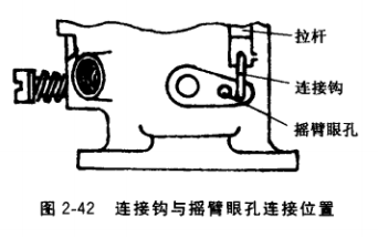 加速泵噴人汽化器的油量,應(yīng)隨季節(jié)的變化予以調(diào)整。 它是借助加速泵搖臂上裝加速泵拉桿連接鉤眼孔進(jìn)行調(diào)節(jié) 的。夏季連接鉤應(yīng)掛在靠近節(jié)氣門軸的搖臂孔中,冬季應(yīng)掛 在左邊的眼孔中,如圖2-42所示。