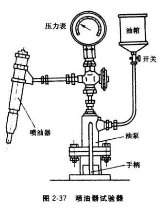 (1) 噴油器的調(diào)整。在檢查、調(diào)整噴油器時,應(yīng)在試驗器上進(jìn)行,如圖2-37所示。
