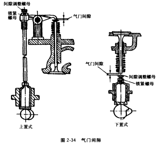 氣門間隙有上置式與下置式兩種,如圖2-34所示。氣門間隙通常是在冷機狀態(tài)下進(jìn)行檢查和調(diào)整的。柴油機、汽油機的氣門間隙在其使用說明書中均有規(guī)定。氣門間隙的檢查和調(diào)整方法如下:
