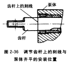 在裝配調(diào)節(jié)齒桿時,齒桿上的刻線應(yīng)與泵體齊平,如 圖2-36所示。若向內(nèi)移入過多而看不到刻線,為最大油量過大;若向外移出過多,為最大油量過小,都必須進(jìn)行調(diào)整。