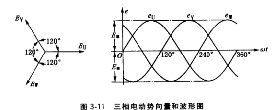 (3) 三相交流電的產(chǎn)生。圖3-9所示發(fā)電機(jī)定子鐵心梢中,沿圓周均勻安置彼此相隔 120°電角度的3個(gè)相同繞組U1U2、V1V2、W1W2,稱為三相繞組。當(dāng)轉(zhuǎn)子旋轉(zhuǎn)時(shí),便可在三相繞組中感應(yīng)出彼此相隔120°電角度的交流電動(dòng)勢(shì)印、eu、ev、ew,其向量和波形如圖3-11 所示。