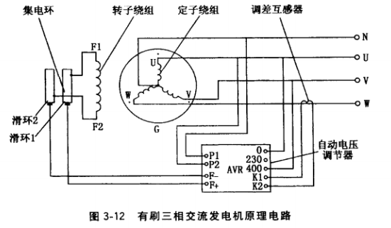(4) 整機(jī)工作原理。有刷三相交流發(fā)電機(jī)原理電路如圖3-12所示。由勵(lì)磁電源輸出的直流電(勵(lì)磁電源可來自直流勵(lì)磁機(jī)發(fā)出的直流電壓、交流勵(lì)磁機(jī)發(fā)出的交流電經(jīng)整流成的直流電壓、定子副繞組感應(yīng)的電壓經(jīng)整流成的苜流電壓、定子主繞組抽頭電壓經(jīng)整流成的直流電壓),經(jīng)滑環(huán)、集電環(huán)向轉(zhuǎn)子磁極繞組F1F2提供勵(lì)磁電流。發(fā)電機(jī)由內(nèi)燃機(jī)驅(qū)動(dòng)至接近額定轉(zhuǎn)速,依靠轉(zhuǎn)子磁極鐵心的剩磁磁場(新機(jī)或經(jīng)大修的舊機(jī)須經(jīng)充磁后,磁極鐵心才有剩磁磁場〉,在定子繞組中感應(yīng)出交流電。由于定子槽中嵌人的繞組按三相布置,因而感應(yīng)出三相交流電壓。調(diào)節(jié)磁場變阻器或自動(dòng)電壓調(diào)節(jié)器(AVR)的電位器,可使發(fā)電機(jī)空載電壓整定在額定電壓值。負(fù)載時(shí),依靠自動(dòng)電壓調(diào)節(jié)器對(duì)轉(zhuǎn)子勵(lì)磁電流進(jìn)行自動(dòng)調(diào)節(jié),以維持發(fā)電機(jī)電壓恒定。未配備自動(dòng)電壓調(diào)節(jié)器的,則依靠手動(dòng)調(diào)節(jié)磁場變阻器對(duì)轉(zhuǎn)子勵(lì)磁電流進(jìn)行調(diào)節(jié),以維持發(fā)電機(jī)電壓接近額定值。