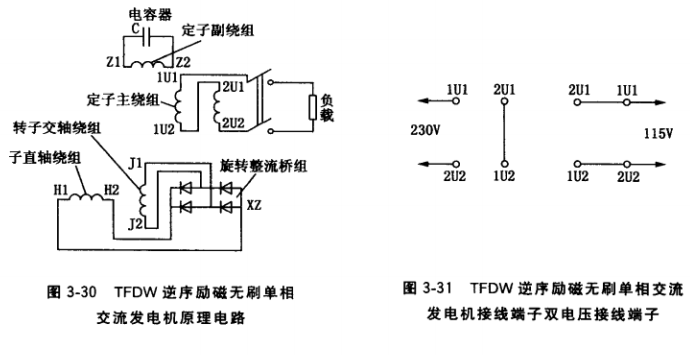 圖3-30為國產(chǎn)TFWD系列隱極式逆序勵磁無刷單相交流發(fā)電機整機原理電路圖, 圖3-31為其接線端子。該系列定子主繞組由兩個完全相同的繞組連接而成,每個繞組頭尾線端標志分別為1U1、1U2和2U1、2U2。兩個繞組不同接法時輸出電壓可為230V或 115V:用接線片連接端子1U2、2U1時,表示主繞組1尾端和主繞組2的頭端連接,此時兩個繞組串聯(lián),輸出電壓為230V;用接線片分別連接1U1、2U1, 1U2、2U2,兩個繞組頭頭連接、尾尾連接,此時兩個繞組并聯(lián),輸出電壓為115V。