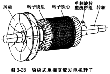 (2) 轉(zhuǎn)子。包括風扇、轉(zhuǎn)子鐵心、轉(zhuǎn)子繞組、單相旋轉(zhuǎn)整流橋組、軸承。轉(zhuǎn)子外形如圖 3-28所示。其風扇、軸承與有刷單相交流發(fā)電機基本一樣,這里不作介紹。