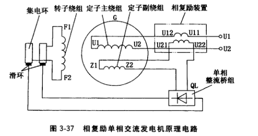 相復(fù)勵單相發(fā)電機原理電路 如圖3-37所示。發(fā)電機由發(fā)動機驅(qū)動至額定轉(zhuǎn)速附近時,依靠轉(zhuǎn)子鐵心剩磁磁場,定子副繞組感應(yīng)的電壓經(jīng)電抗變流器二次繞組的移相作用,提供建立發(fā)電機空載電壓的交流勵磁電流的電壓分量,經(jīng)單相整流橋組整流后,向發(fā)電機轉(zhuǎn)子繞組提供空載勵磁電流,發(fā)電機很快自勵建立空載電壓。