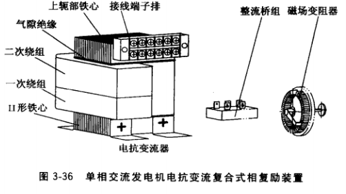 (2) 相復(fù)勵裝置。其外形、結(jié)構(gòu)如圖3-36所示,它包括電抗變流器、單相整流橋組和磁場變阻器。作為可控相復(fù)勵裝置,還必須外配分流式自動電壓調(diào)節(jié)器。