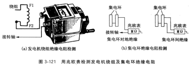 兆歐表的2個接線柱經絕緣導線分別與集電環的2個銅環相接,見圖3-121b (右),手搖兆歐表手把,即測得2個銅環間的絕緣電阻。