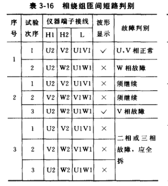 當測得波形異常而斷定繞組匝間有短路時,還必須査找短路發生在哪一相或哪一磁極, 則可按表3-16的接線,分別檢測U、V相,V、W相,W、U相,或1、2極,2、3極,3、 4極,4、1極的波形。匝間短路可按表3-16和表3-17判別。