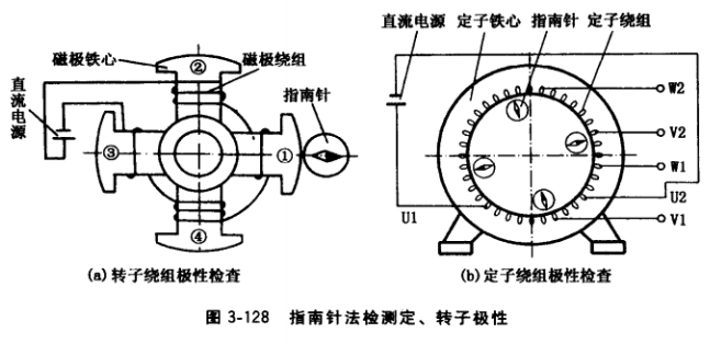 (1)檢査轉(zhuǎn)子極性。把轉(zhuǎn)子垂直落地,接線見圖3-128a。繞組中通直流電后,把指南針靠近磁極鐵心,并緩緩移動一圈。若繞組接線正確,則指南針從①→④極靠近鐵心時(shí),磁針轉(zhuǎn)向鐵心的順序是白、黑、白、黑(或黑、白、黑、白〉,否則即可判斷繞組接線錯(cuò)誤。