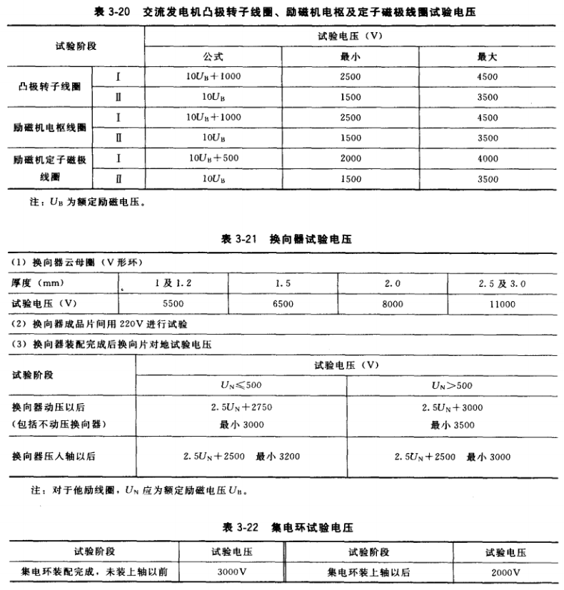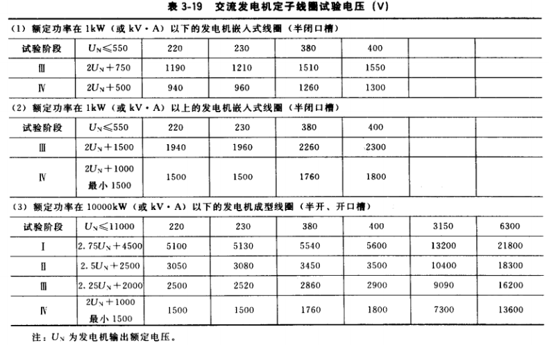 發電機繞組及各帶電器件按表3-19~表3-22所列試驗電壓(有效值),應能承受歷時1 分鐘而不發生擊穿或閃爍現象。
