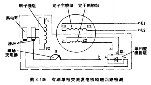 圖3-136雙點(diǎn)劃線框內(nèi)的部分是這種發(fā)電機(jī)勵(lì)磁回路,包含定子副繞組Z1Z2、單相整流橋組QL、磁場(chǎng)變阻器R、集電環(huán)、轉(zhuǎn)子繞組F1F2及各段連接線。檢測(cè)前先拆開(kāi)單相整流橋組交、直流側(cè)各一個(gè)接點(diǎn),然后按以下順序檢測(cè):
