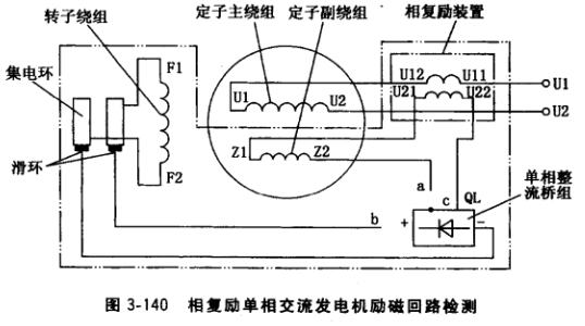 圖3-140雙點(diǎn)劃線框內(nèi)部分為這種發(fā)電機(jī)勵(lì)磁回路,包含定子副繞組、相復(fù)勵(lì)裝置二次繞組、單相整流橋組、集電環(huán)、轉(zhuǎn)子繞組及各段連接線。檢測(cè)前先拆開(kāi)單相整流橋組交、直 流側(cè)各一個(gè)接點(diǎn),然后按以下順序檢測(cè):