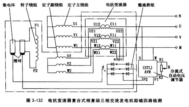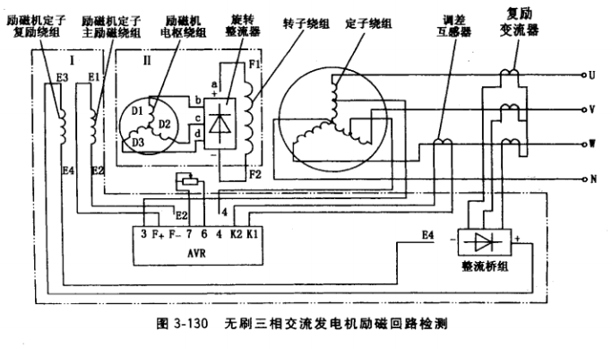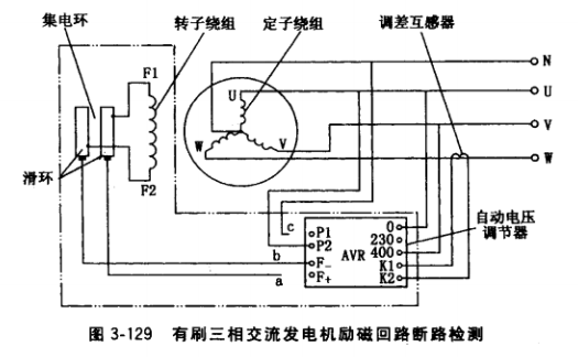 圖3-129中雙點(diǎn)劃線框內(nèi)部分為這種發(fā)電機(jī)勵(lì)磁回路,它包括U相定子繞組、AVR (或整流橋組)、集電環(huán)、轉(zhuǎn)子繞組F1F2及各段連接線。