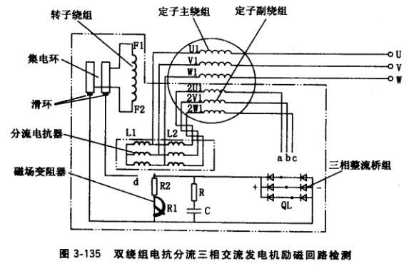 圖3-135雙點(diǎn)劃線框內(nèi)部分是這種發(fā)電機(jī)勵(lì)磁回路,包含三相電抗器、定子三相副繞組、三相整流橋組、轉(zhuǎn)子繞組、集電環(huán)、磁場(chǎng)變阻器、分流變阻器及各段連接線。檢測(cè)前先拆開(kāi)定子三相副繞組與三相整流橋組交流側(cè)的連接,集電環(huán)與磁場(chǎng)變阻器的一端連接。然后 按如下順序檢測(cè):
