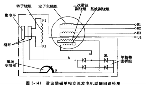 圖3-141雙點(diǎn)劃線框內(nèi)部分為這種發(fā)電機(jī)勵(lì)磁回路,包含定子三次諧波副繞組、定子基波副繞組、單相整流橋組、磁場(chǎng)變阻器、集電環(huán)、轉(zhuǎn)子繞組及各段連接線。檢測(cè)前先拆開(kāi)單相整流橋組交、直流側(cè)各一個(gè)接點(diǎn),然后按以下順序檢測(cè):