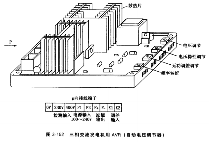 AVR功能及接口:檢測電壓輸入,接于發(fā)電機三相輸出端線電壓400V或相電壓230V上;電源電壓輸入P1、P2,,接于發(fā)電機定子主繞組U、V相中點抽頭200V或機端相電壓 230V上(有的AVR不分檢測輸入和電源輸入,僅設置一個電壓信號接口,接于機端相電壓或線電壓上);勵磁輸出F+、F-(有的標志為F1、F2),接于有刷發(fā)電機集電環(huán)電刷引線(見圖3-12)或無刷發(fā)電機交流勵磁機定子主勵磁繞組線端E1、E2 (見圖3-16);調差輸入K1、K2 (露出電位器旋鈕),接于W相上的調差互感器二次繞組線端,考慮到50kW 以下發(fā)電機一般不作并列運行,有的小型AVR就不設置調差環(huán)頻率轉折(低頻保護用),已在AVR內部接好線而不外接;電壓調節(jié)(露出電位器旋鈕),已在AVR內部接好線而不外接;電壓穩(wěn)定性(露出電位器旋鈕),已在AVR內部接好線而不外接。有的AVR 還設置有外接電位器接口,用于需遠程外接調節(jié)電壓的發(fā)電機;有的AVR還設罝有外接常開起勵按鈕,用于鐵心容易失磁的發(fā)電機。