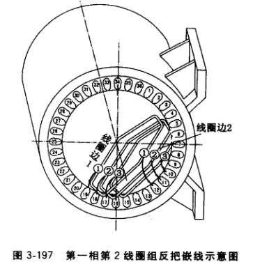 必須注意的是,一般每相線圈的第1線圈組和第2線圈組是連繞,甚至第1?第4線圈組都連繞,對此,每嵌到每相第2、第4線圈組時 (即順序為雙)應反把嵌線,其方法是:嵌每相第2、第4線圈組時,把線圈邊1和線圈邊2對調嵌入槽中。以該發電機繞組為例,嵌第一相 第2線圈組時,線圈邊1應嵌入17、18、19號 槽,線圈邊2則嵌在10、11、12號槽(見圖 3-197)。以此類推,每嵌到雙序號線圈組均按此 方法嵌線。