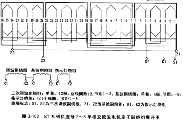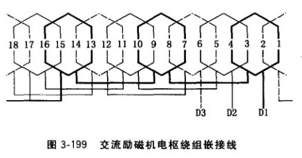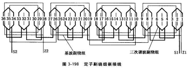 (3)定子副繞組接線。三相的,按圖3-198及其說明的方法,單相的按上述“單相交流發(fā)電機(jī)定子繞組嵌線”的方法,示例見圖3-102。