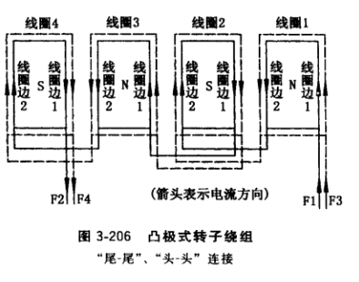 (1)發(fā)電機(jī)的極數(shù)和極性。各類發(fā)電機(jī)銘牌上都明確規(guī)定該發(fā)電機(jī)的極數(shù),如銘牌產(chǎn)品型號是TZH-75-4,其中的4就表示該發(fā)電機(jī)為4極。這個極數(shù)必須通過極性體現(xiàn)出來,也就是說不論轉(zhuǎn)子還是定子必須有N、S、N、S ,4個極性,要獲得這樣4個極性繞組就必須正確連接。圖3-204是一套繞組,該繞組由線圈1到線圈4串聯(lián)而成,當(dāng)給繞組通入圖示箭頭方向直流電時,根據(jù)右手螺旋定則,線圈1產(chǎn)生的磁場方向?yàn)殡x開紙面出來,設(shè)定其極性用 “N”表示,線圈2產(chǎn)生的磁場極性方向?yàn)槌蚣埫妫錁O性用“S”表示。同樣,線圈3產(chǎn)生的磁場極性為“N”,線圈4產(chǎn)生的磁場極性為“S”,這樣形成4個極性。注意,這套繞組的連接方法是線圈1的尾線和線圈2的尾線連接,線圈2的頭線和線圈3的頭線連接,線圈3的尾線和線圈4的尾線連接。這個接法俗稱為“尾-尾”連、“頭-頭”連接。