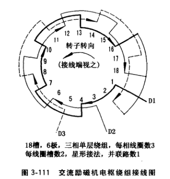 (2)按“發(fā)電機(jī)繞組的相位和相位差”介紹的方法算得該勵磁機(jī)每個槽距電角度= (360°×3) /18 = 60°,則第二相繞組始端槽位在(120/60) + 1 = 2+1槽,即3號槽,第3 相繞組始端在5號槽,按“尾-頭”連接法分別把第二、三相3個線圈接成極性為N、S、 N、S、N、S的6個極的相繞組。