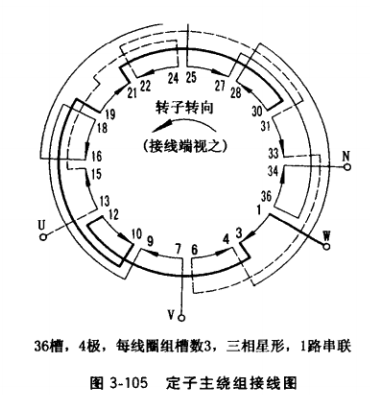(1)定子三相主繞組接線。要獲得三相繞組的正確接線,必須符合4點(diǎn)要求:每一相繞組必須接成該發(fā)電機(jī)規(guī)定的極數(shù),且均布于定子圓周; 任意兩相繞組之間相位差應(yīng)等于 120°電角度;三相電壓U、V、W的相序應(yīng)符合順相序,按設(shè)計(jì)規(guī)定或銘牌規(guī)定接成三相繞組。以圖3-105所示36槽、4極、每線圈組槽數(shù)3、1路串聯(lián)、三相星形接法的定子主繞組接線為例,介紹接線方法。圖中,內(nèi)圈帶箭頭的12個弧線表示12個線圈組(4極發(fā)電機(jī), 每相一般設(shè)計(jì)有4個線圈組,三相共有12個線圈組),箭頭方向表示每相4個線圈組要形成 4極極性N、S、N、S所必需的正確的電流方向,數(shù)碼編號表示槽號,中間的帶箭頭圓弧線 表示轉(zhuǎn)子旋轉(zhuǎn)方向(從定子繞組接線端視之)。接線順序: