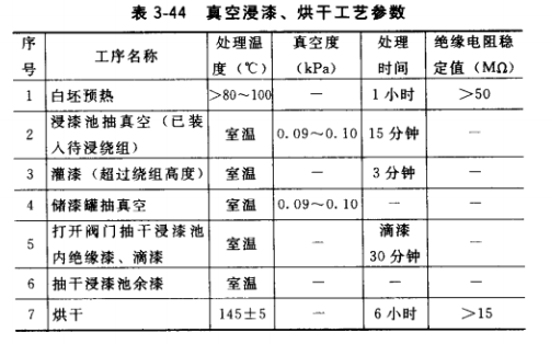 (3)設(shè)備及工具。真空浸漆、烘干成套設(shè)備;烘房;吊運工具:吊車、平車、鐵筐;儀 器:涂-4粘度計,秒表,溫度計(0?200℃), 500V兆歐表。
