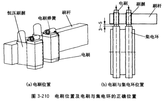 (3)電刷的正確安裝,電刷必須和刷握、刷桿等組合成電刷裝置,如圖3-210a所示。 然后固定在發(fā)電機(jī)后端蓋的內(nèi)軸承蓋上,方可正常運(yùn)行。電刷裝置與集電環(huán)或換向器之間應(yīng)有正確的安裝位置(見(jiàn)圖3-210b):電刷應(yīng)垂直于集電環(huán)外圓周面,刷握下緣邊與集電環(huán)外圓周面的距離應(yīng)為3?5mm,在軸向方向上電刷應(yīng)位于集電環(huán)寬度的中間位置。