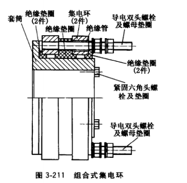 (2)更換集電環(huán)。可請(qǐng)發(fā)電機(jī)生產(chǎn)廠家提供同規(guī)格新集電環(huán),或就地加工組合式集電 環(huán),其結(jié)構(gòu)如圖3-211所示。圖中每個(gè)序號(hào)代表1個(gè)零件,根據(jù)集電環(huán)的總體尺寸,制作每個(gè)零件,并組裝成集電環(huán)。集電環(huán)中兩個(gè)滑環(huán)應(yīng)經(jīng)對(duì)地及環(huán)與環(huán)之間耐壓檢測(cè),合格后經(jīng)浸絕緣漆處理,裝上轉(zhuǎn)子,再經(jīng)車床加工外圓面后,方可投入使用。