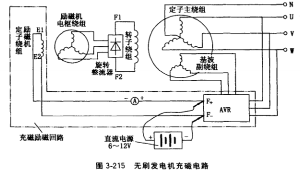 圖3-215中雙點劃線范圍為充磁回路,包括AVR自動電樂調節器輸出端“F+”、“F-”端、直流電流表、勵磁機定子繞組端點E1、E2。充磁前發電機充磁勵磁電路應完好,發電機處于停機或運轉狀態。6?12V直流電源“+”極觸AVR的“F1”端(或“+”端), “-”極觸AVR的“F2” 端(或“-”端),此時直流電流表表針正向偏轉,說明轉子繞組中有直流電流通過,完成充磁工作,即可脫離直流電源。有的發電機未裝勵磁電流表,且試驗臺上也未裝勵磁電流表,則最好在發電機旋轉情況下充磁,觀察交流電壓表有電壓指示, 且脫離充磁電源后發電機能維持電壓,即完成充磁。