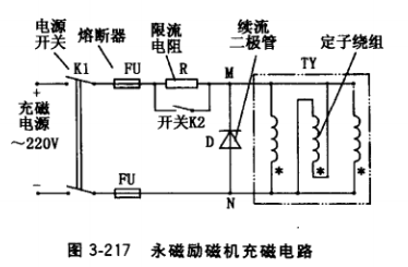 ①接線。如圖3-217所示,把永磁機定子三相繞組任一相反相,然后三相繞組并聯連接。續流二極管D用于在切斷充磁電源時,給定子三相繞組儲能提供放電回路,以免繞組產生過電壓而導致定子繞組絕緣損壞。限流電阻 R可用500?1000W電阻爐或同容量燈泡。開 關K2與電阻R并聯,K2合上時,將電阻R短 路。直流充磁電源經開關K1、熔斷器FU后 接入。