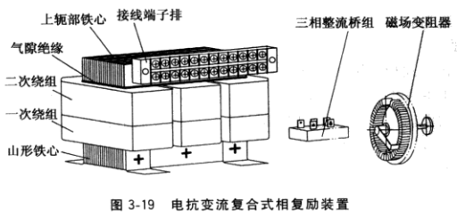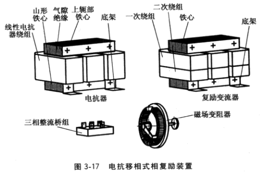 ⑤電抗器(見圖3-17)或電抗變流器(見圖3-19)的上軛鐵與山形鐵心之間氣隙太小甚至相碰,電抗值太大,發電機勵磁繞組得不到足夠的勵磁電流,無法建立電壓。