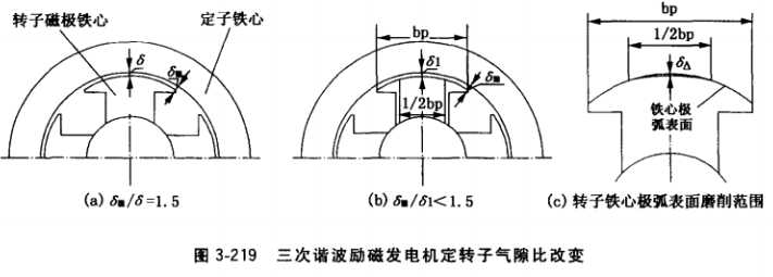 a.改變定、轉子氣隙比。圖3-219a為發電機原來定、轉子氣隙比為δm/δ=1.5的結構, 圖3-219b為改變轉子鐵心極弧表面尺寸的結構,在極弧表面1/2寬度的中央部分磨削δΔ= 0.2-0. 3mm (小功率發電機取小值,較大功率發電機取大值),使中央氣隙由δ增大為δ1, 其作用是減小氣隙比,使δm/δ1<1.5,最好能做到1.4或略小于1.4,可明顯增強氣隙磁場 中的三次諧波含量,發電機容易自勵建立電壓。