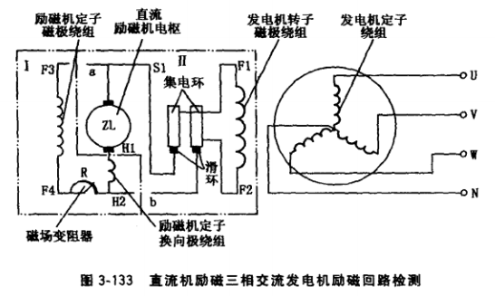 ②勵磁回路斷線或接觸不良。該發電機勵磁回路見圖3-133中雙點畫線框Ι和Ⅱ內兩部分電路。框I部分為直流勵磁機勵磁回路,包含定子磁極繞組、磁場變阻器、定子換向極繞 組及各段連接線。框Ⅱ部分為三相交流發電機勵磁回路,包含轉子繞組、集電環及各段連接 線。當該回路斷線或電氣接觸嚴重不良時,發電機無勵磁電流。