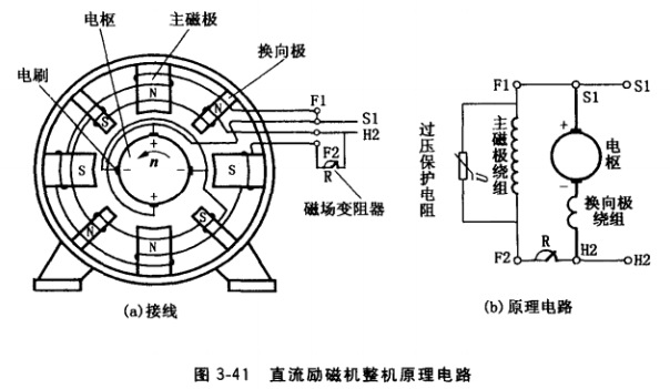 直流勵磁機作為三相交流發(fā)電機傳統(tǒng)的勵磁電源,使用量大面廣。其實際上是并勵直流 發(fā)電機,定子主磁極上裝有主磁極繞組,繞組兩端與電樞并聯(lián)。