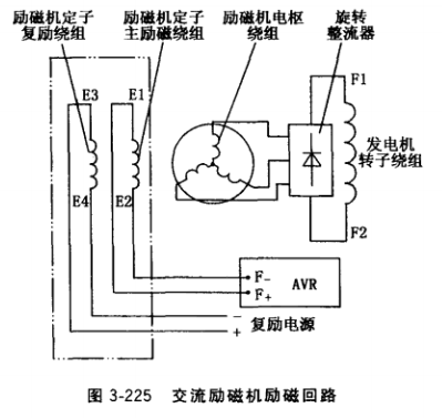 ②勵磁回路斷線或電氣接觸不良。交流 勵磁機勵磁回路見圖3-225雙點畫線框內(nèi)電 路,包含勵磁機定子主勵磁繞組E1E2、勵 磁機定子復勵繞組E3E4、AVR輸出端子及 各段連接線。勵磁回路任何一處斷線或電氣 接觸嚴重不良,都導致勵磁電流無通路,發(fā) 電機不能發(fā)電。