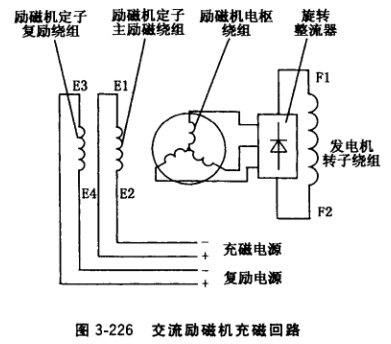 充磁電路見圖3-226。充磁電源正端“ + ”接 定子主勵繞組線端E1,負端“-”接定子主 勵繞組線端E2,不可接錯。