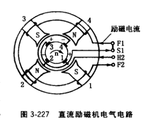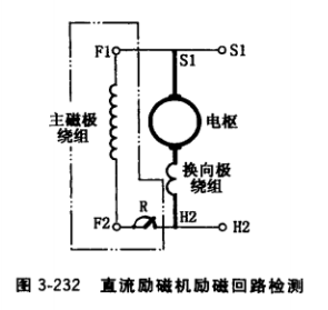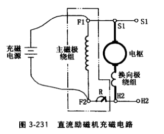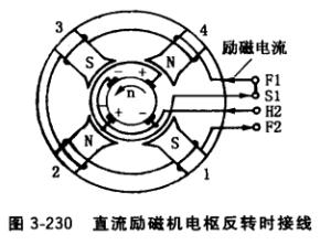 ①改正發(fā)電機電樞轉(zhuǎn)向,或在出線盒上對調(diào)F1和F2 的接線位置。也可按圖3-230接線,即S極下電刷(變?yōu)?負極性)電纜引出端接H2, N極下電刷(變?yōu)檎龢O性) 電纜引出端接S1。