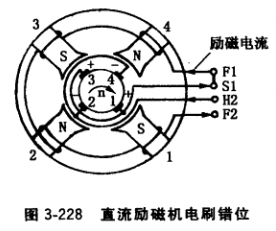 ③刷架位置錯誤。因發(fā)電機大修拆下直流勵磁機刷架 而重新裝上去時,刷架位置可能錯過一個極距,如圖3- 228所示,電刷1錯位到磁極4下面,電刷2落到磁極1 下面,如同上述錯接線,每個磁極下的電刷極性總是削弱 磁極的磁通,無法建立電壓。
