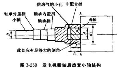 加工過程時,先將母軸斷裂端切除,并車好d及ι。準備型料或鍛制的小軸,經(jīng)正火處理,然后車制d1和ι,1在小軸熱套段端頭鉆一個直徑3?5mm小孔,以便于熱套小軸時空 氣由此逸出。小軸其他擋留精車余量。可用電熱或噴燈加熱套,.使小軸熱套段脹大,然后迅速套入母軸。為使小軸順利套到底,小軸必須有足夠大的倒角尺寸。熱套后精車其他各擋 到所需尺寸,但需保證小軸和母軸間的同軸度,對氣隙較大的發(fā)電機,小軸亦可全部精車后 熱套,這時應選用較大的ι值,使過盈值盡可能小,以減少因熱套而引起的小軸彎曲變形。