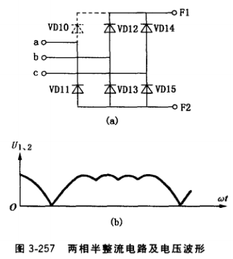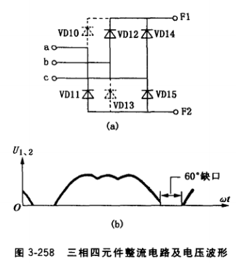 順便指出,如果正極或負極都不相連的兩個 整流管,如圖3-258a中VD10、VD13 (虛線部分)損壞,將VD10、VD13拆除,而不進行元 件移補,則其電路和電壓波形如圖3-258b所示, 其輸出電壓數(shù)值上與單相橋式整流輸出電壓相 等,但波形有所不同,每個周期有60°缺口。
