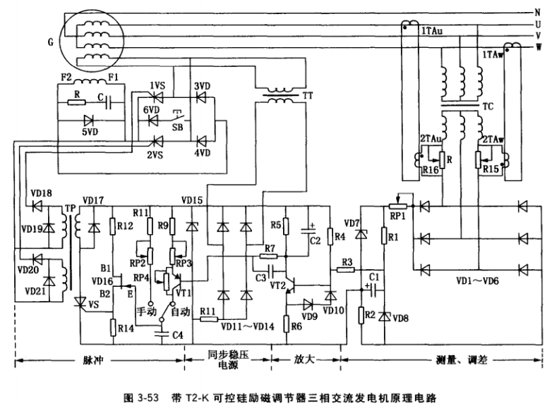①如圖3-53所示,測量回路比較橋穩壓管VD7、VD8或放大管VT2損壞,使可控硅導通角關至最小,發電機勵磁電流不足(欠勵)。