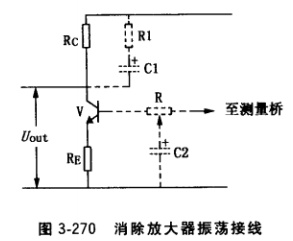 ③加校正環節(積分延時電路)。可在放大器的集電極電阻RC上并接R1、C1,也可在測量橋放大器之間加入R、C2,如圖3-270中虛線所示,其作用是對測量橋測得的機端信號進行延時,使放大器的輸出電壓UOUT變成較平滑的漸變過程,相當于對測量信號加以移相,使勵磁調節器不至于由負反饋變成正反饋,從而消除振蕩。