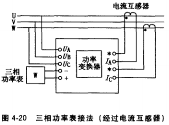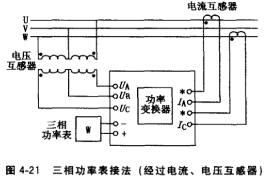 (3)接入三相功率表的三相電壓和電流均經(jīng)互感器,再接至功率變換器.如圖4-21所 示。這種接法只要配上不同變比的電壓、電流互感器,可測(cè)任何電壓、電流下的功率。