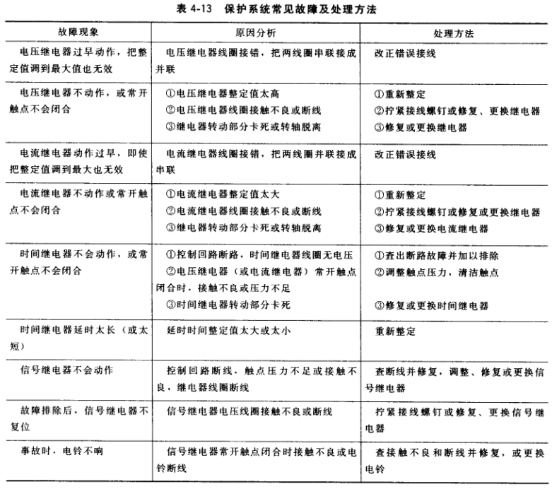保護系統(tǒng)常見故障現(xiàn)象、原因分析及處理方法見表4-13。