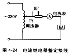 ③電流繼電器KAU (或KAV或KAW)整定(見圖4-24)。斷開KAu (或KAV.、KAW) 線圈的外接線,將它與變阻器RP,電流表A串聯(lián)后,接入調(diào)壓器TY的輸出端。將調(diào)壓器 輸出調(diào)至0,變阻器RP調(diào)至敢大阻值并在TY輸入端接入交流220V電源。先將KAu (或 KAV、KAW)整定旋鈕轉(zhuǎn)至最大整定值位置,然后慢慢調(diào)節(jié)調(diào)壓器的輸出電壓(粗調(diào))并 減小變阻器R阻值(細調(diào)使通過KA,,(或KAV、KAW)線圈電流達到整定值,再將繼 電器整定旋鈕往整定值小的方向慢慢旋轉(zhuǎn),使繼電器動作,常開觸點閉合-接著把調(diào)壓器回 調(diào),使繼電器常開觸點斷開.然后將調(diào)壓器輸出增大,使電流達到整定值,看繼電器是否動 作,若不動作或動作過早再來回整定幾次,直到繼電器動作值與整定值相符為止。最后將調(diào) 壓器輸出電壓調(diào)至0,變阻器阻值調(diào)至最大。